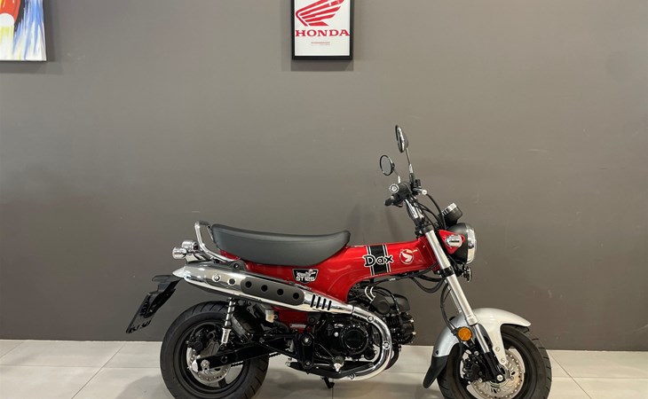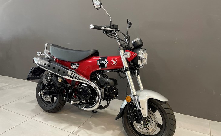 Die ST125 Dax verfügt über 12-Zoll große Minibike Balloon Reifen mit geschwärzten Aluminiumguss-Felgen für mühelose Agilität in der Stadt.
